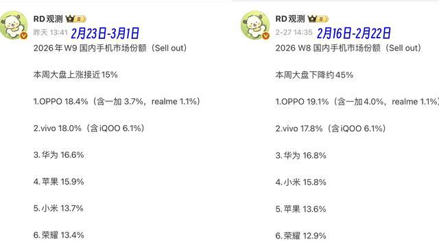 今天分享的是2026年W9国内手机排行榜,时间区间是2026年2月23日到3月1日,也就是农历的正月初七到正月十三。随着春节假期的结束,本周智能手机大盘上涨接近15%,榜单排名和上周基本上保持一致。其中苹果打败小米排名第四,华为稳居第三名,OPPO以18.4%的份额超过了vivo,拿到了今年的该品牌的第一个双连冠。